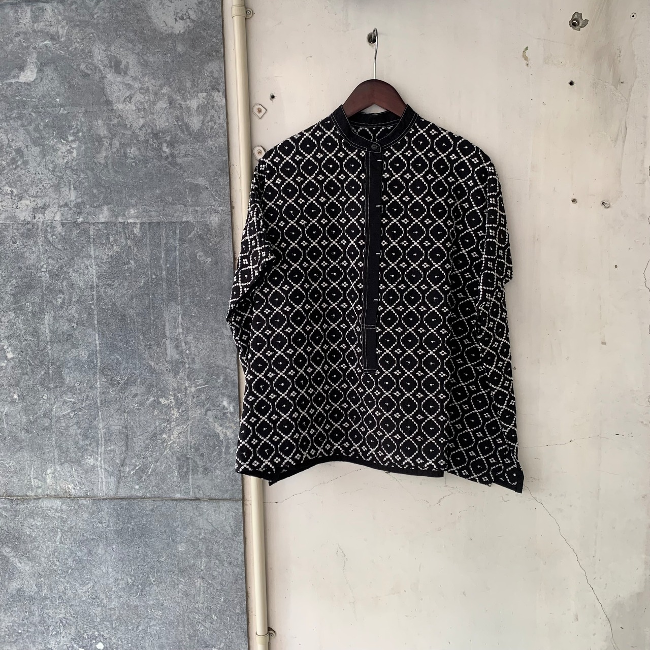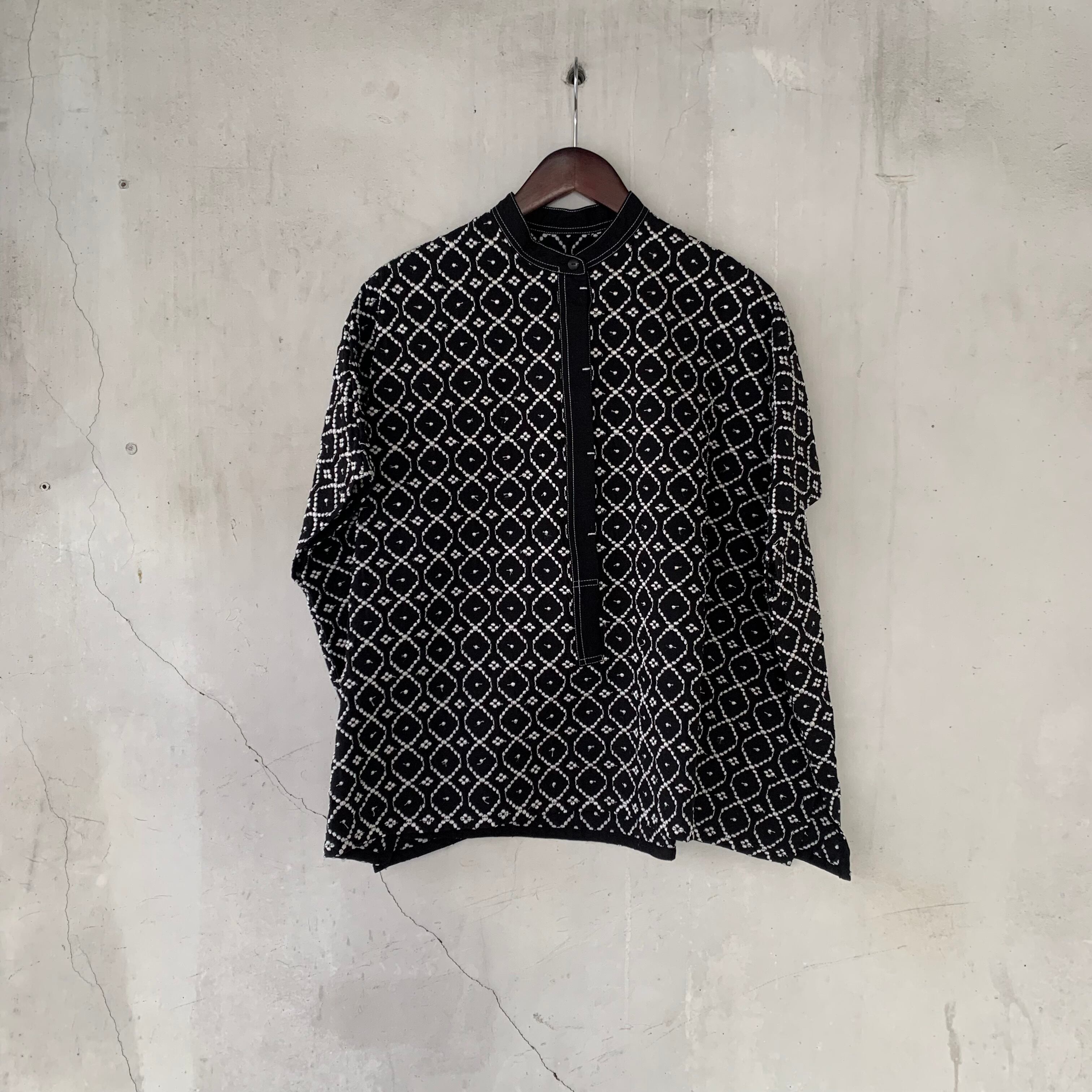 襟ぐりに無地を合わせて引き締めたスクエアシルエットのブラウス。