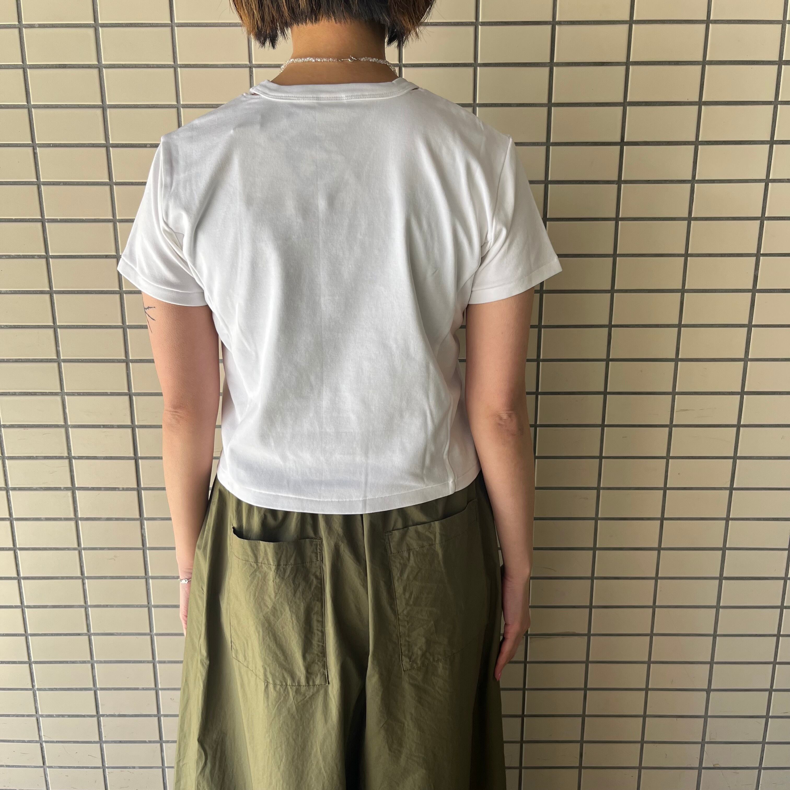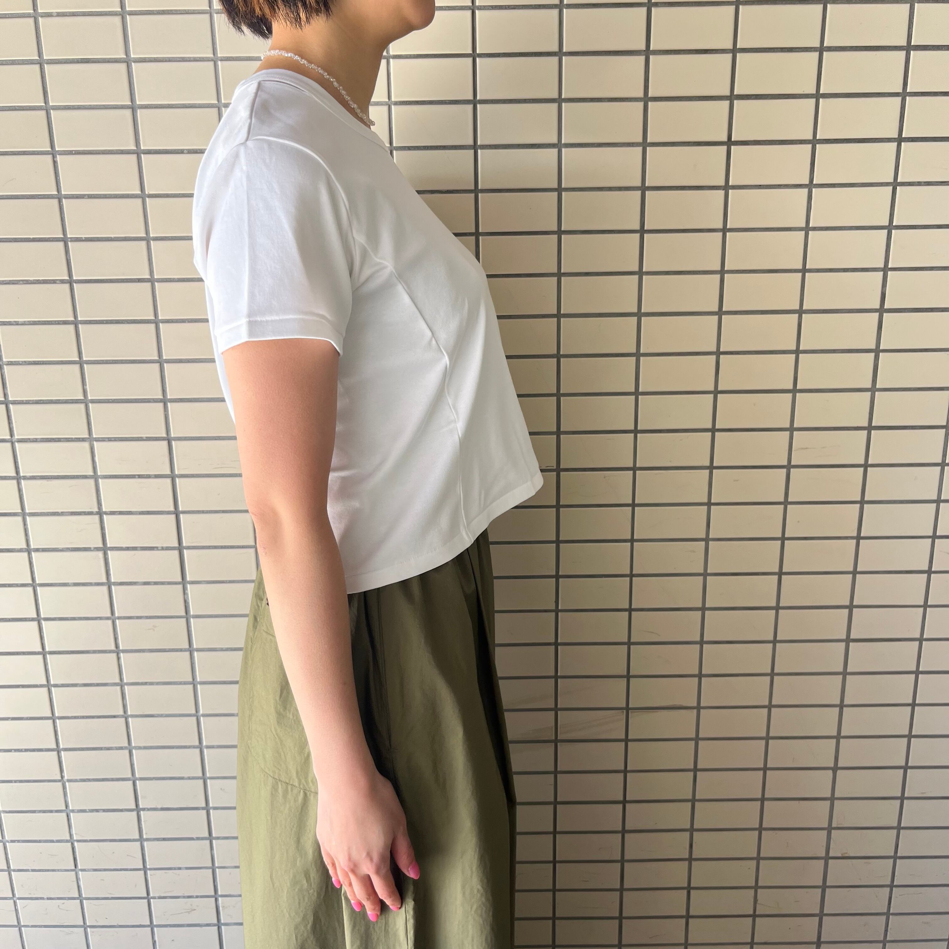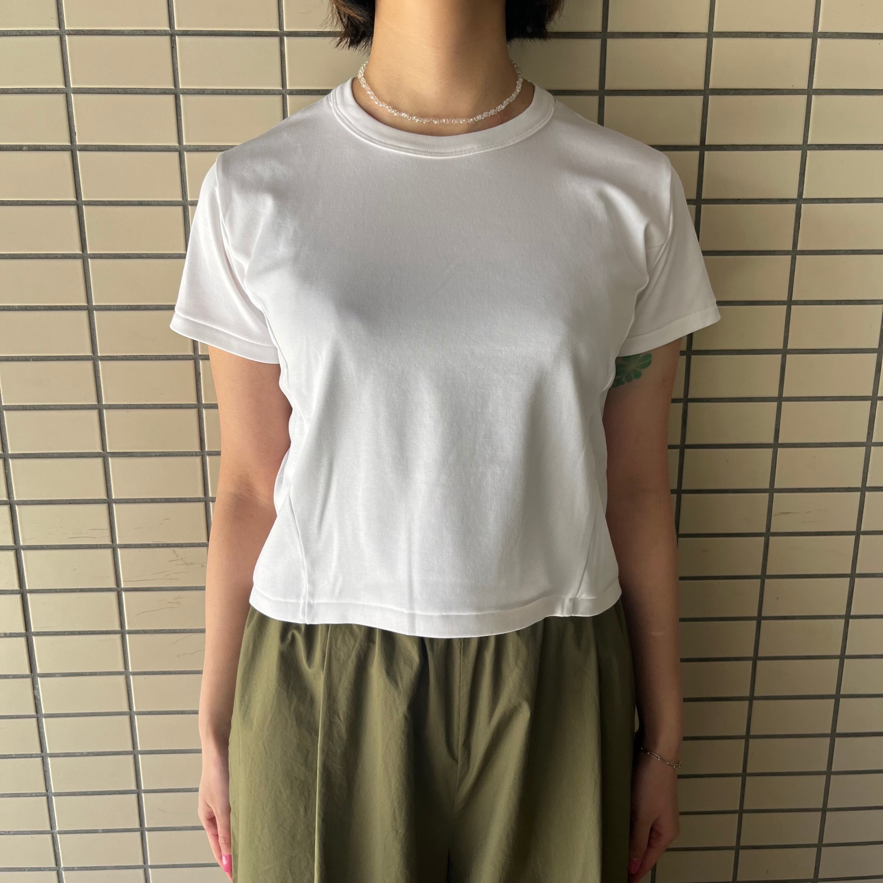 ショート丈のコンパクトな半袖Tシャツ。