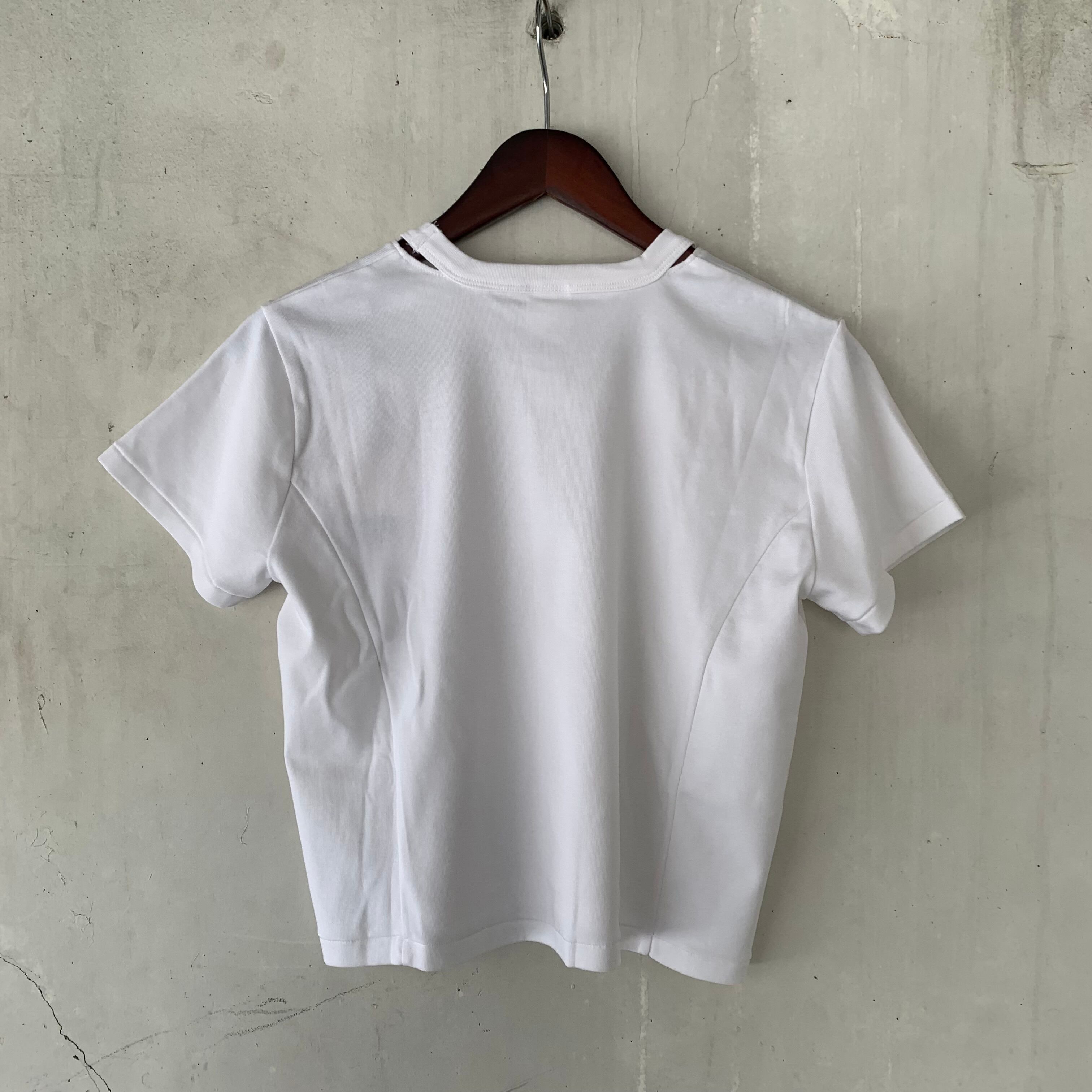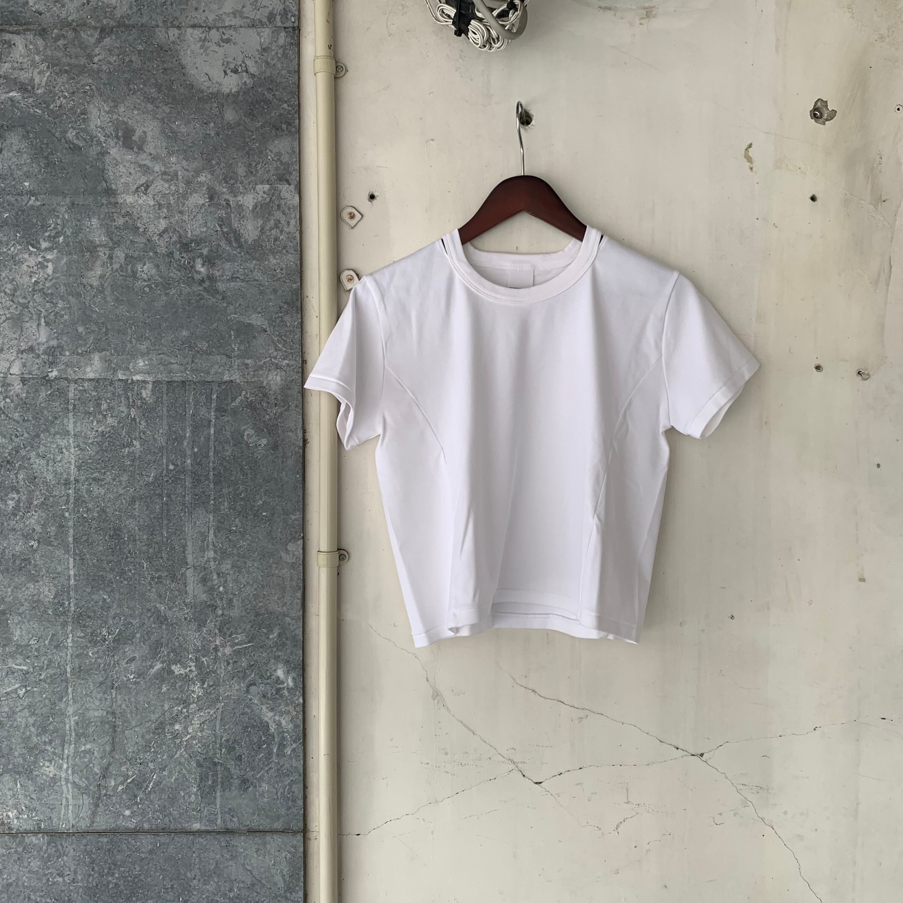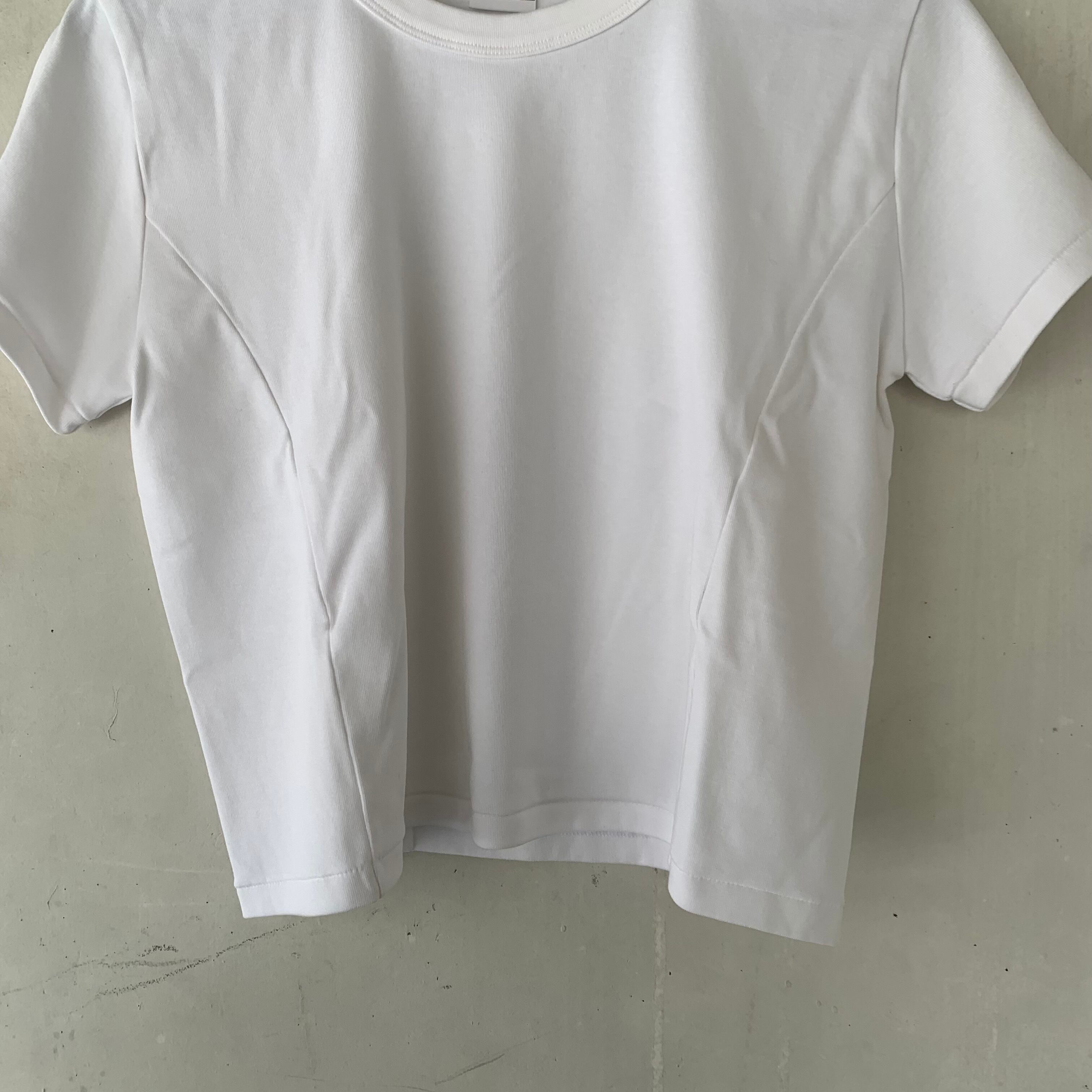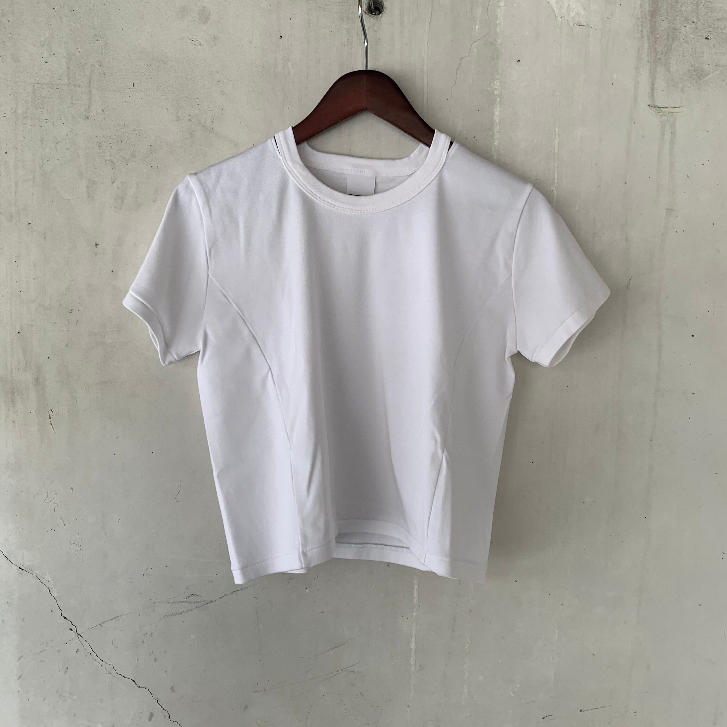 ショート丈のコンパクトな半袖Tシャツ。